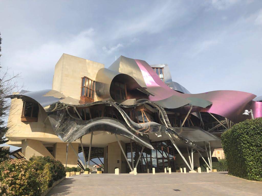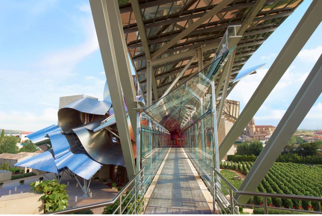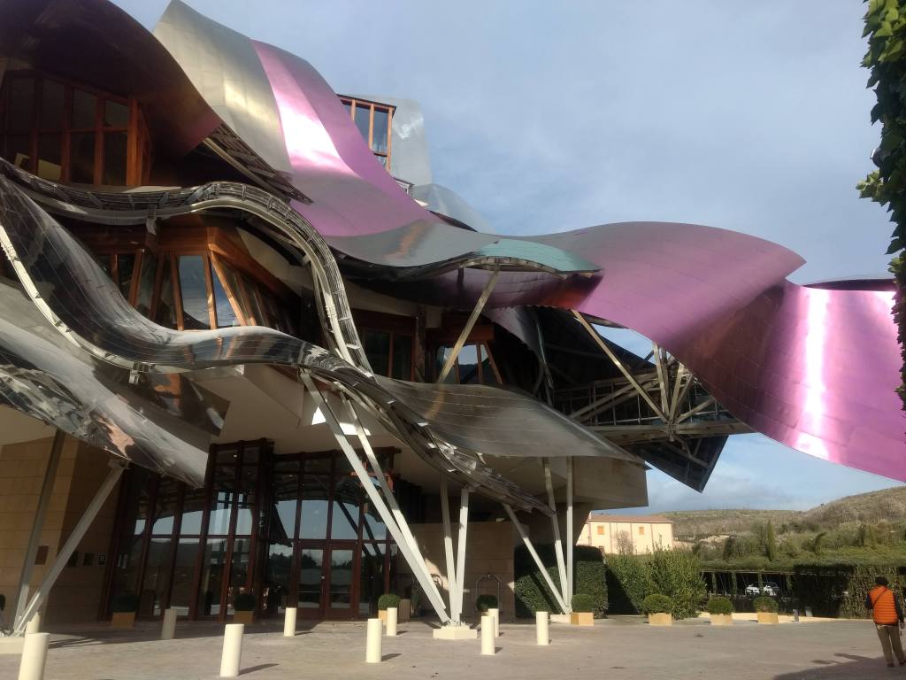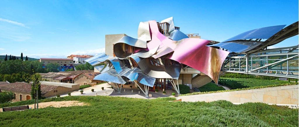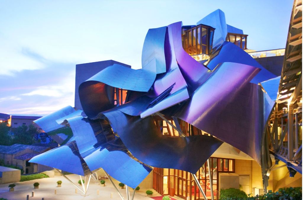 El edificio está inspirado en los vinos y comunica esa cultura vinícola que envuelve al Marqués de Riscal. Gerhy ha dejado su firma en este lugar con el uso de revestimiento exterior de titanio de formas ondulares, pero esta vez ha dotado a su metal icónico con los colores que evoca al vino, titanio rosa en alusión al vino, oro pensando en la malla que cubren las botellas de Riscal y plata inspirado en la cápsula que cubre el corcho y superficies prismáticas en distintos niveles.