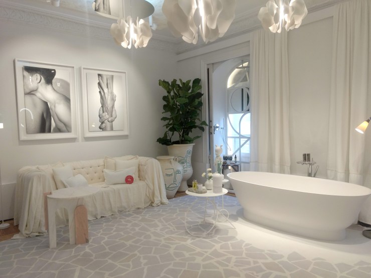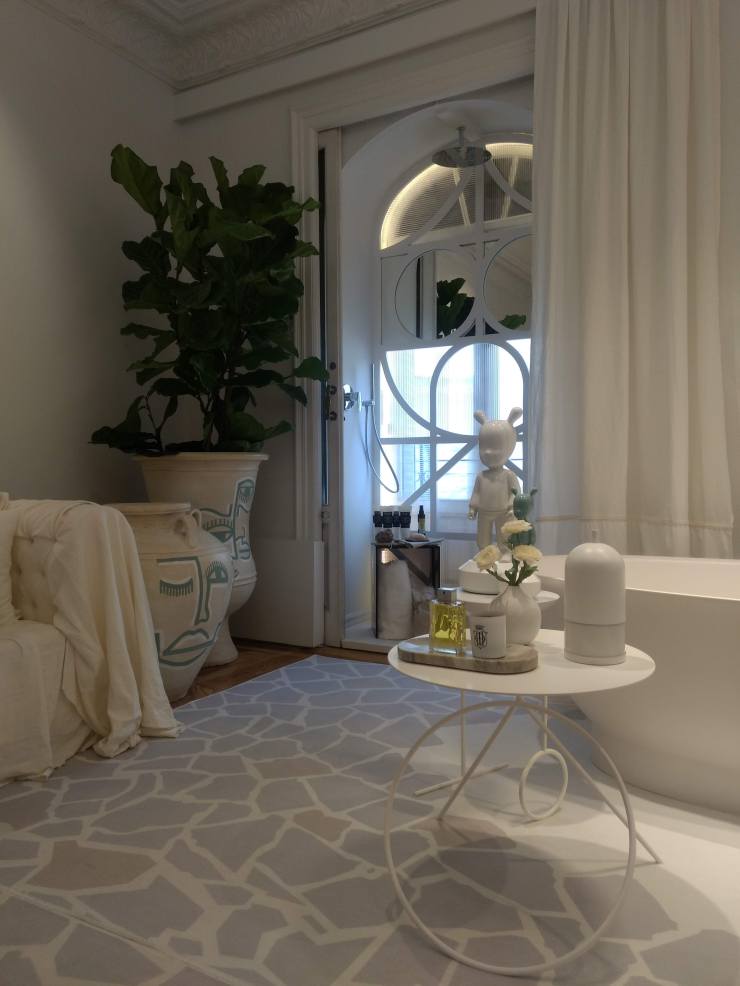 Al llegar dentro de este espacio sin duda, es una atmósfera que evoca relax y la contemplación, el estudio Sinmas se ha inspirado en la importancia del agua, una muestra pura de los elementos aplicados al espacio, la tranquilidad del “total White” del ambiente resalta entre piezas de arte utilizadas especialmente para ese espacio entre macetas de gran formato, junto a dibujos estilizados de rostros (que está muy de tendencia) me recuerda mucho a esos espacios marroquíes, pero la verdad es que su inspiración llega desde las montañas suizas hasta el mar mediterráneo, que puede darme algo de razón. Es de agradecer su gran cuidado en su proyección sostenible y el cuidado por el medio ambiente. Donde nos exhibe elementos del lanzamiento de la nueva línea de Laufen The new classic diseñado por el holandés Marcel Wanders un concepto contemporáneo que vas a querer en tú nuevo baño.