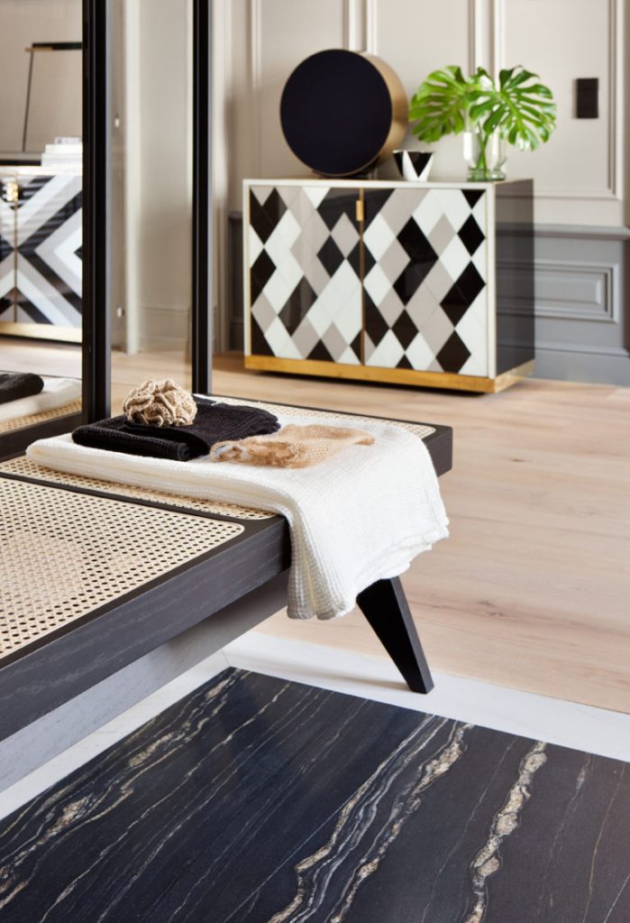 Este baño es un llamado a la calma y sofisticación. Los materiales utilizados son en tonos neutros, claramente domina el negro y blanco, es un baño con mucha personalidad, incluyendo todos los accesorios utilizados de la firma Parisina Jacob Delafon, una bañera con un diseño retro incorporado en un espacio con un aire natural junto a esa gran maceta dorada y el trío de cuadros a blanco y negro. Junto a la bañera un espacio encantador de un sillón y “coffe tables” con un diseño que me volvió loca y estoy deseando poder usarlo en mis próximos proyectos, los radiadores de diseño de la firma Tubes, “plug and play collection” que si queremos incorporar estilo son los indicados.