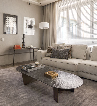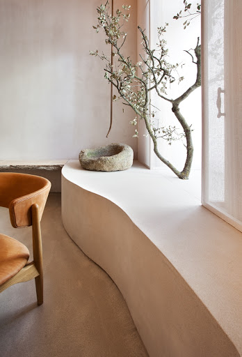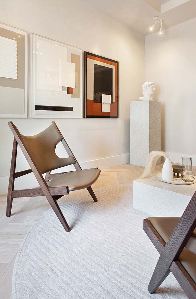 Es un diseñador y artista que me sorprende con cada espacio que realiza, al llegar a su espacio me recibió su lienzo “Carla” un rostro de aspecto hiper real al estilo retrato, ¡una pasada! Junto con un espacio que transmite mucha tranquilidad, pero a su vez muy acogedor. Un concepto de estilo nórdico – mediterráneo, limpio con lo justo y necesario para generar esa atmósfera envolvente. Utilizó materiales porcelánico Dekton Liquid Shell del Grupo Cosentino para las mesas centrales inspirado en la textura de las conchas marinas.