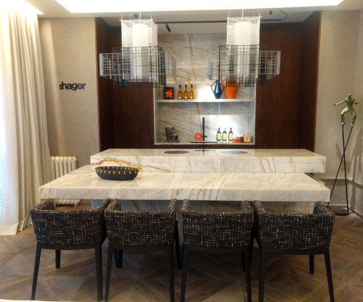 Sin duda uno de mis espacios preferidos en esta edición donde se encuentra el cuidado en todos los elementos utilizados, un estilo sobrio y contemporáneo, reflejando un principio de la Bauhaus, donde la forma sigue a la función y aquí se percibe tan solo al ingresar. Un diseño con muchas líneas atemporales, sobrias y muy elegante. El matiz entre la funcionalidad y diseño están muy bien sintonizadas. En el espacio de la cocina las lámparas son un encanto que sobresale en el espacio, realizadas en varillas con tonos monocromáticos. Este espacio ha sido creado para Hager, que refleja gratamente su estilo.