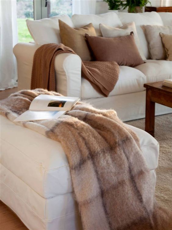 Nada dice otoño como acurrucarse en una manta suave y esponjosa. Introduce mantas de lana, cojines de terciopelo y alfombras mullidas para crear una sensación de calidez y confort. Opta por patrones inspirados en la naturaleza, como hojas caídas o motivos geométricos, para añadir un toque de estilo.