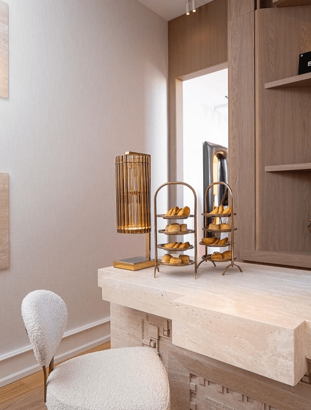 Doré Lifestyle de Beatriz Silveira x Eichholtz: Un salón acogedor que da paso a un comedor con bar, donde el lujo y la sofisticación son protagonistas. Los elementos neutros y cálidos, como el travertino, se hacen presentes en este espacio. En conjunto la elegancia y el cuidado al color y acabados se hacen presentes.