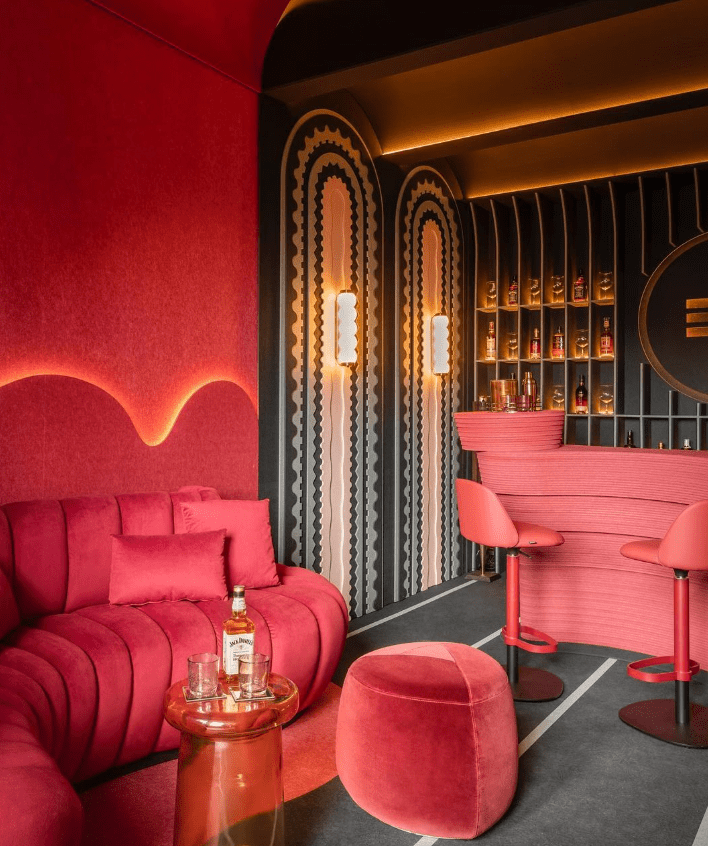 Beatbar: Diseñado en colaboración con ECOcero y la interiorista Alejandra Pombo, combina innovación acústica y diseño creativo en tonos granates y verdes, proporcionando una puesta en escena de una coctelería clandestina.