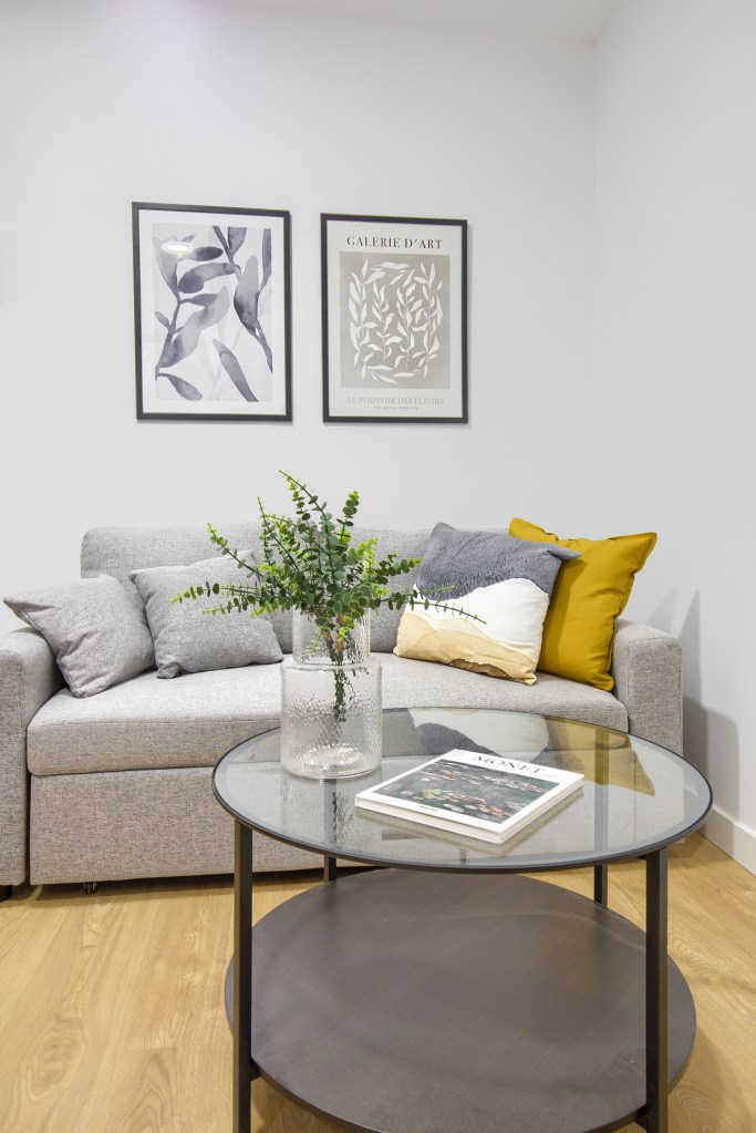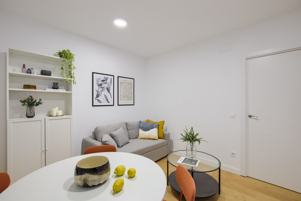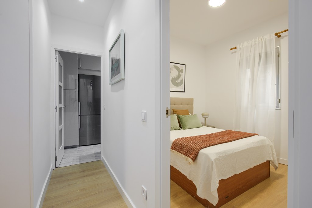 En el proyecto Porvenir se realizó la reforma, proyecto de interiorismo y equipamiento para un piso de alquiler turístico. Cambiamos la distribución de la zona del salón y comedor y habitaciones. Creamos un espacio de día más amplio y una habitación principal y simple.